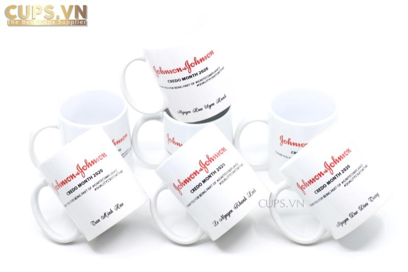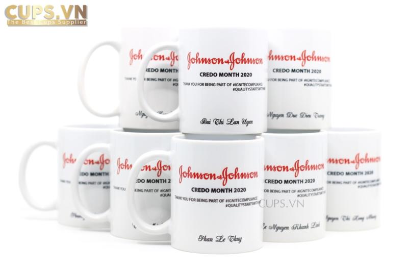 Cốc sứ màu trắng in tên nhân viên – Món quà tri ân từ Johnson & Johnson