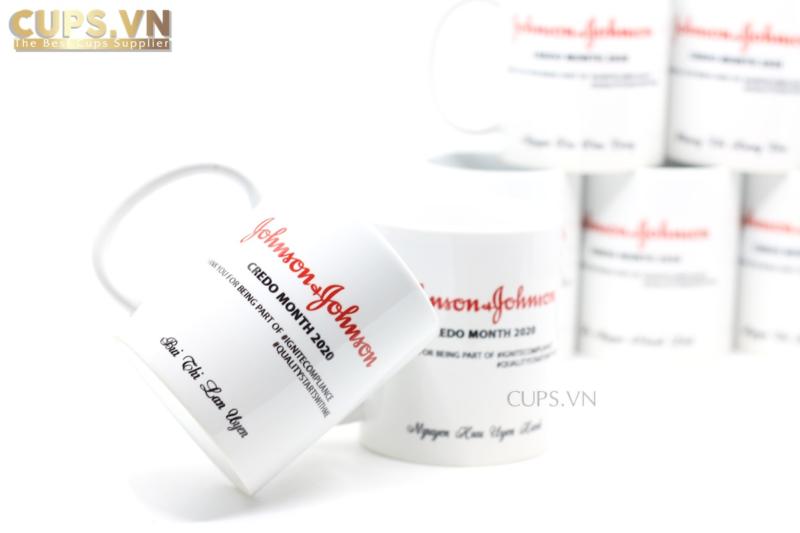 Cốc sứ màu trắng in tên nhân viên – Món quà tri ân từ Johnson & Johnson