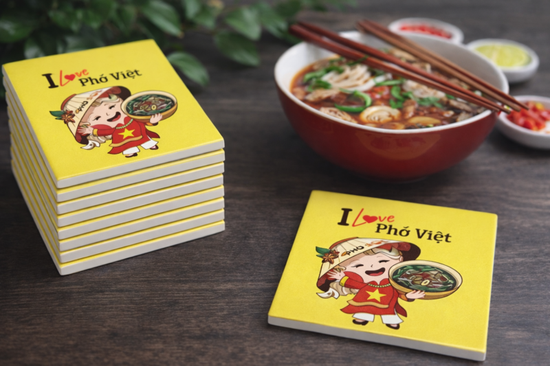 Trong ngành F&B, trải nghiệm khách hàng không chỉ đến từ món ăn mà còn từ từng chi tiết trên bàn. Phở Sol sử dụng lót ly gốm sứ in logo như một phần của không gian phục vụ, giúp bàn ăn gọn gàng, sạch sẽ và tăng tính thẩm mỹ.