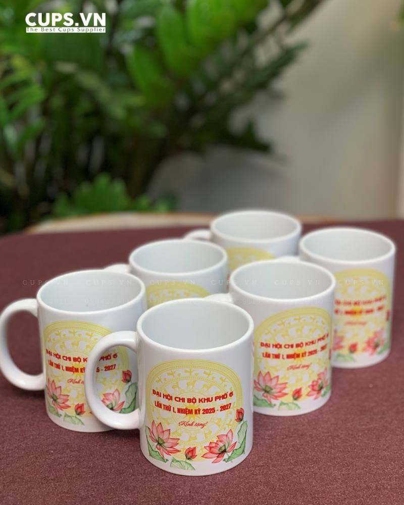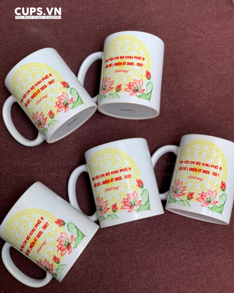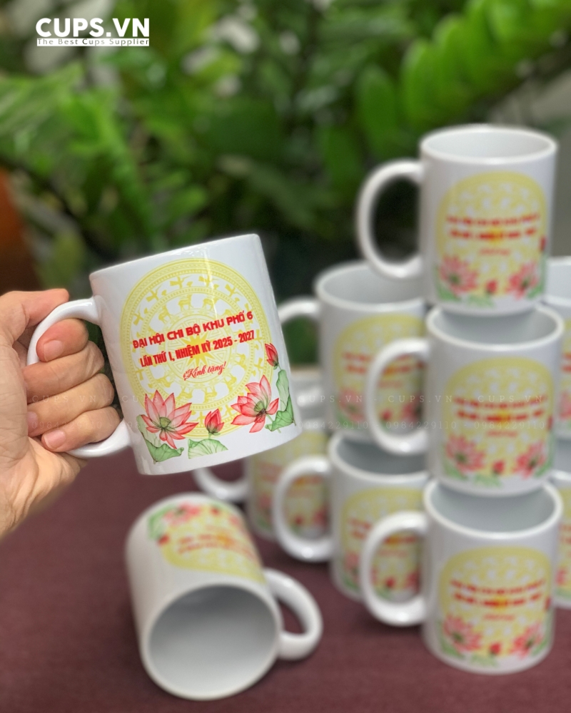 Hình ảnh 2: Ly sứ Đại Hội Chi Bộ Khu phố 6 in ấn họa tiết trống đồng và hoa sen làm quà kỉ niệm – thể hiện sự trân trọng và tôn vinh giá trị văn hóa của tổ chức!