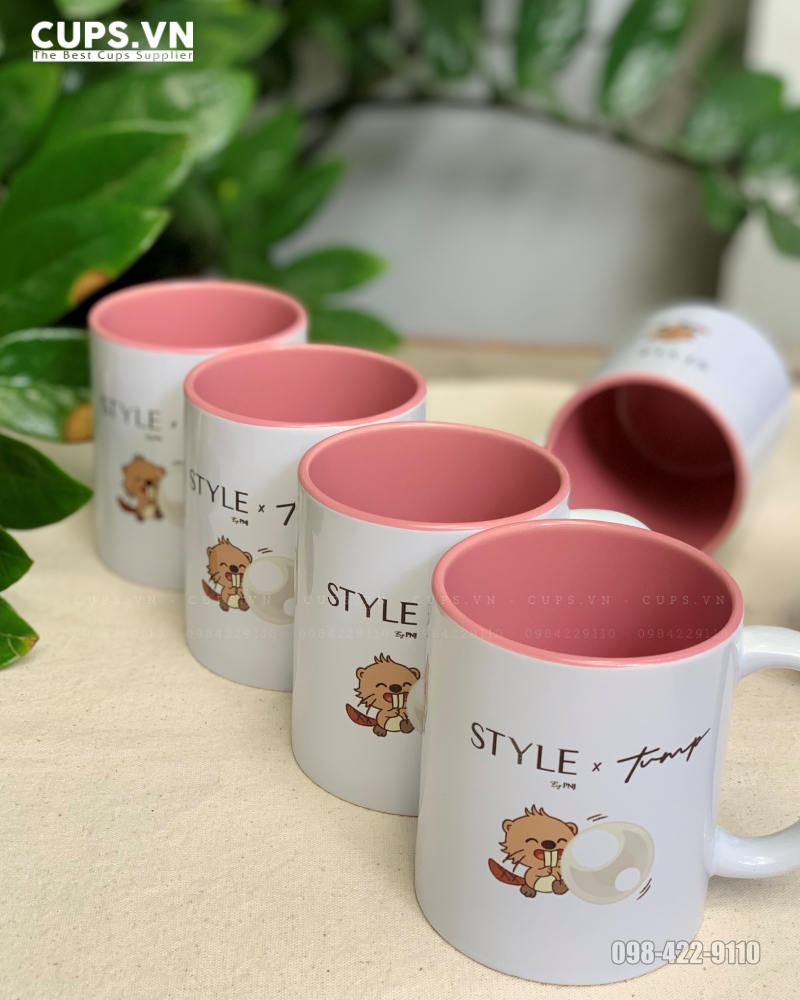 - Cận cảnh ly sứ lòng màu in logo nổi bật