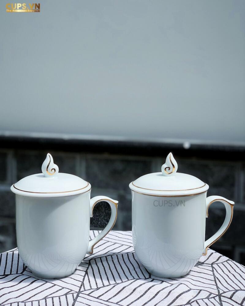 Ly sứ có nắp đậy viền vàng của dòng ly sứ in ly quà tặng thu hút từ cái nhìn đầu tiên của khách hàng bởi dáng vẻ bầu bĩnh nhưng vẫn cực kỳ tao nhã, thanh thoát, đặc biệt là núm nắp cầm hình ngọn lửa tạo nên một điểm nhấn và sự khác biệt so với các dòng ly khác.