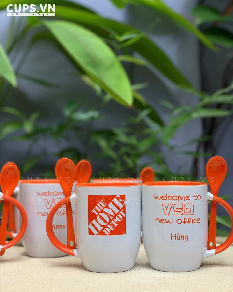 - Ly sứ in logo The Home Depot cực ấn tượng trên ly bầu muỗng cam